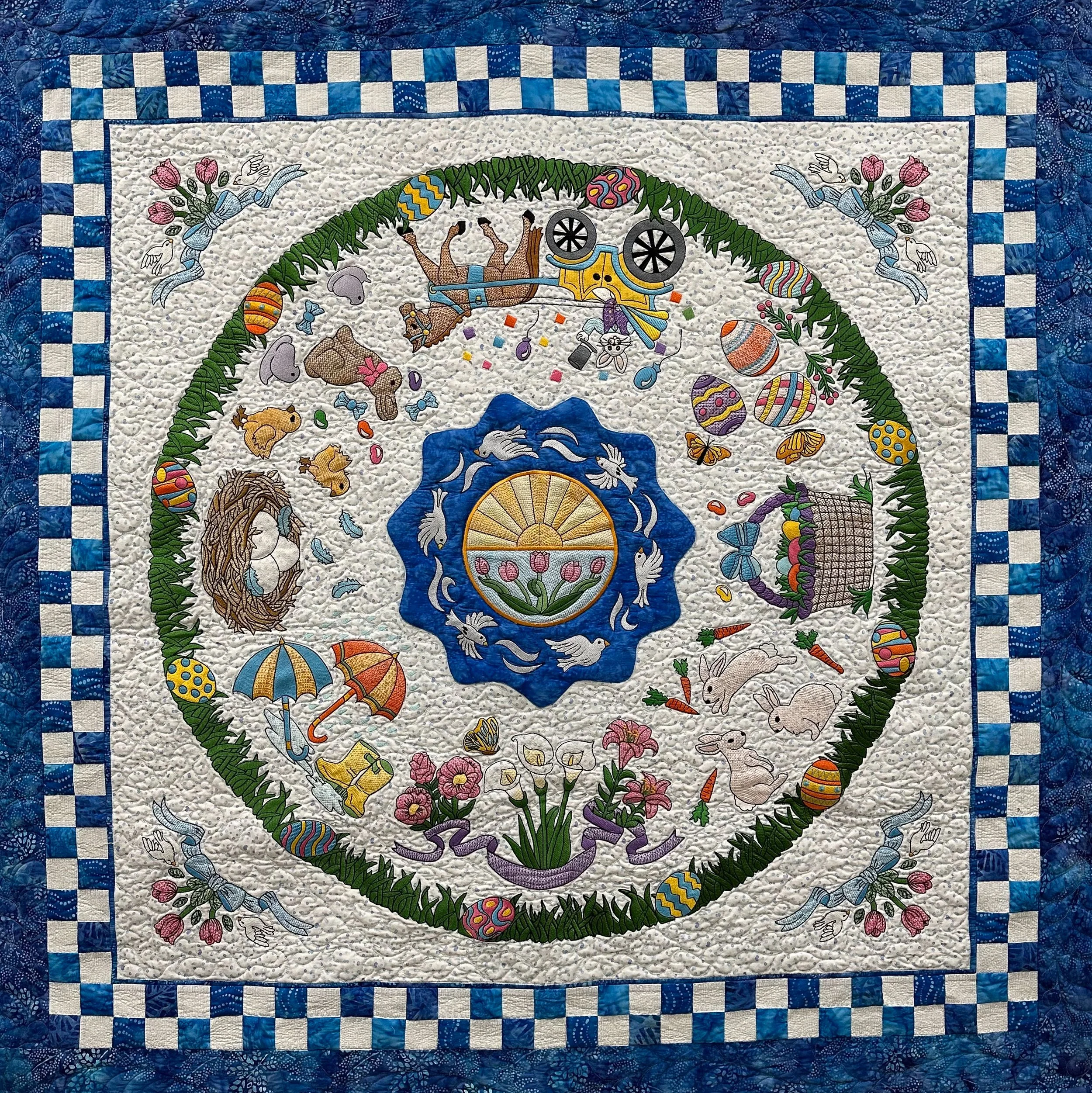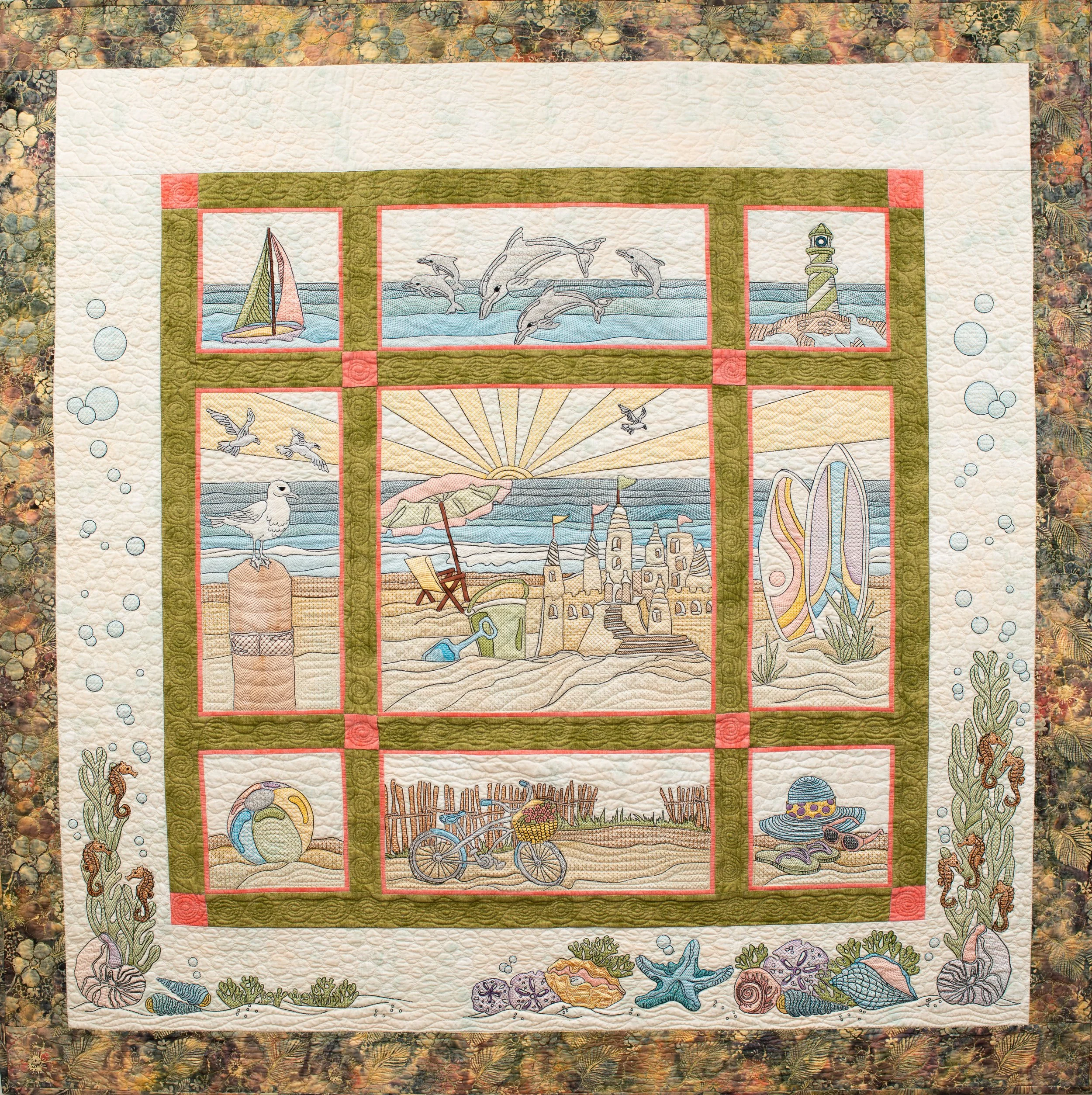 This nostalgic Americana home town parade encompasses the spirit of love, pride and patriotism for our country! The corners are embellished with dimensional stars and stripes and/or an option for military images. Red & white striped pieced borders are complimented by the embroidered stars on the outer blue border.